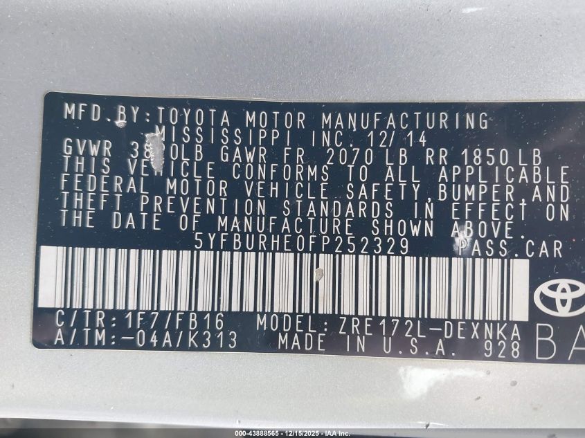 2015 TOYOTA COROLLA - 5YFBURHE0FP252329, цвет - Серебряный, 1.8, Бензин, Передний привод из США