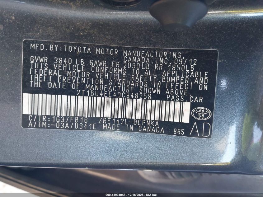2013 TOYOTA COROLLA - 2T1BU4EE4DC948258, цвет - Серый, 1.8, Бензин, Передний привод из США