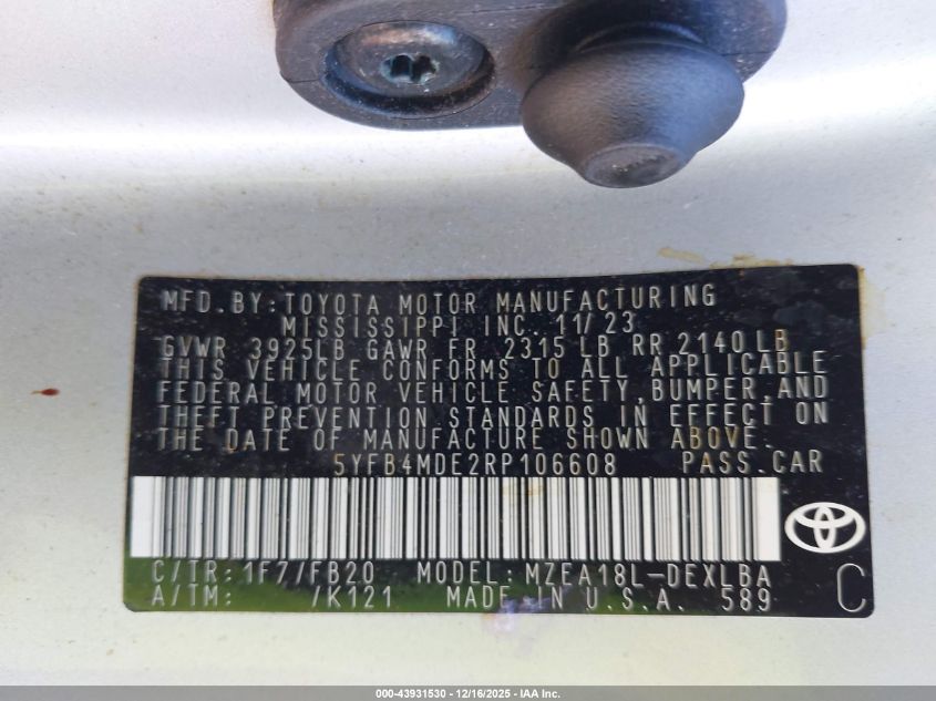 2024 TOYOTA COROLLA - 5YFB4MDE2RP106608, цвет - Серебряный, 2.0, Бензин, Передний привод из США