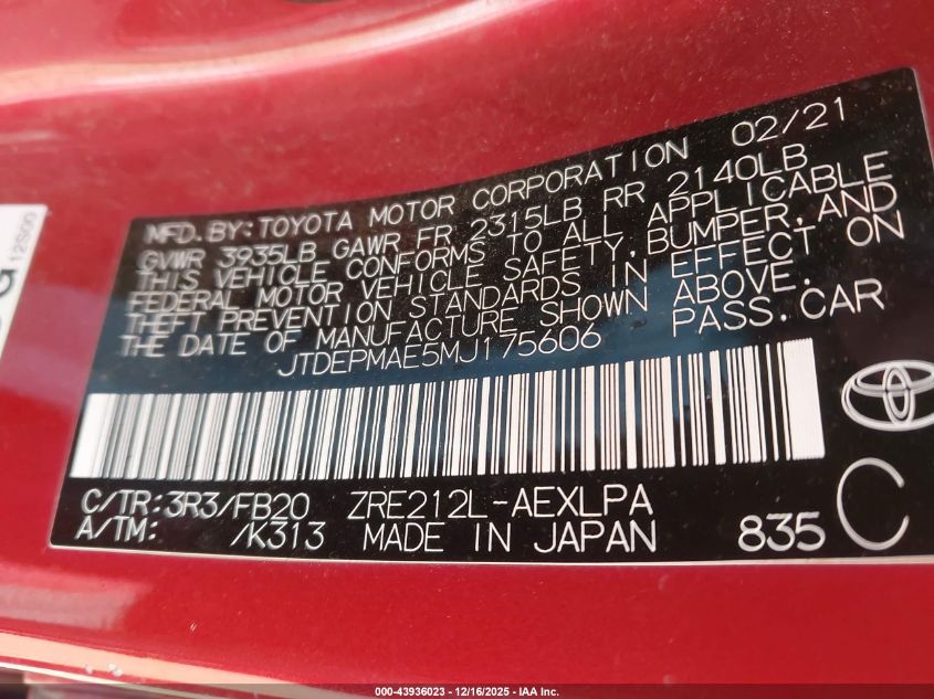 2021 TOYOTA COROLLA - JTDEPMAE5MJ175606, цвет - , 1.8, Бензин, Передний привод из США
