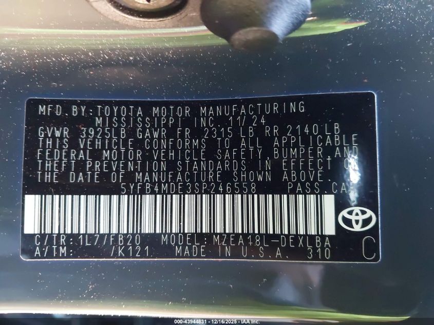2025 TOYOTA COROLLA - 5YFB4MDE3SP246558, цвет - , 2.0, Бензин, Передний привод из США