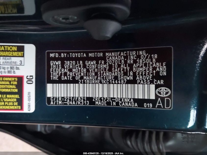 2019 TOYOTA COROLLA - 2T1BURHE1KC144487, цвет - , 1.8, Бензин, Передний привод из США