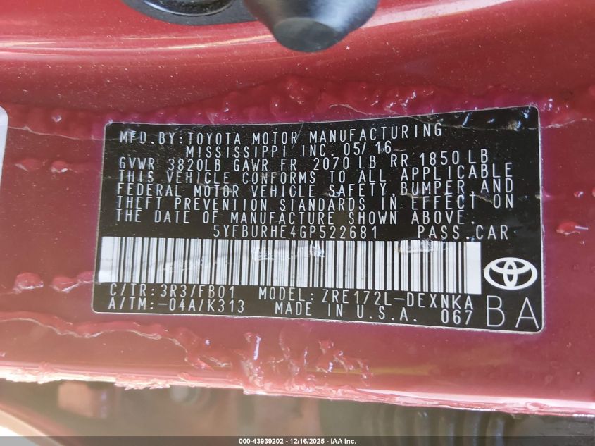 2016 TOYOTA COROLLA - 5YFBURHE4GP522681, цвет - , 1.8, Бензин, Передний привод из США