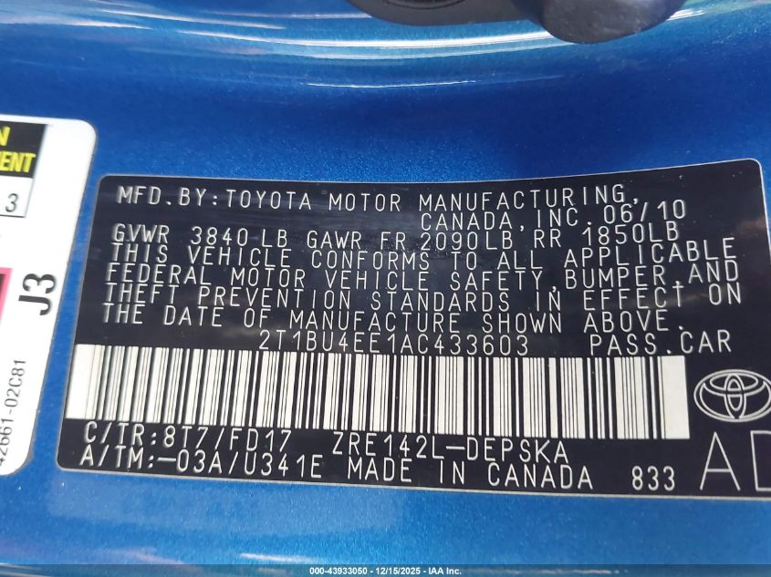 2010 TOYOTA COROLLA - 2T1BU4EE1AC433603, цвет - Синий, 1.8, Бензин, Передний привод из США