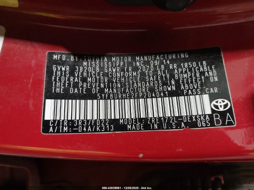 Цвет КрасныйЦилиндры 4Привод Передний приводVIN 5YFBURHE2FP204041Состояние Заводится и едет (проверено)Повреждения Обычный износДата аукциона 2025-12-15