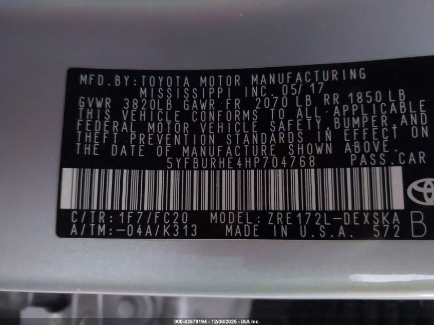 2017 TOYOTA COROLLA - 5YFBURHE4HP704768, цвет - Серебряный, 1.8, Бензин, Передний привод из США