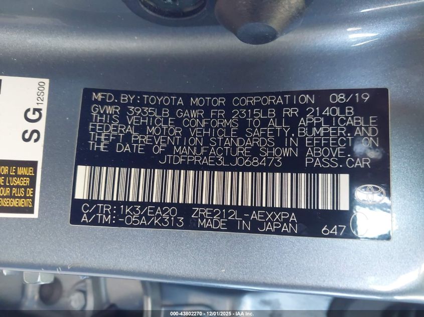 2020 TOYOTA COROLLA - JTDFPRAE3LJ068473, цвет - Синий, 1.8, Бензин, Передний привод из США