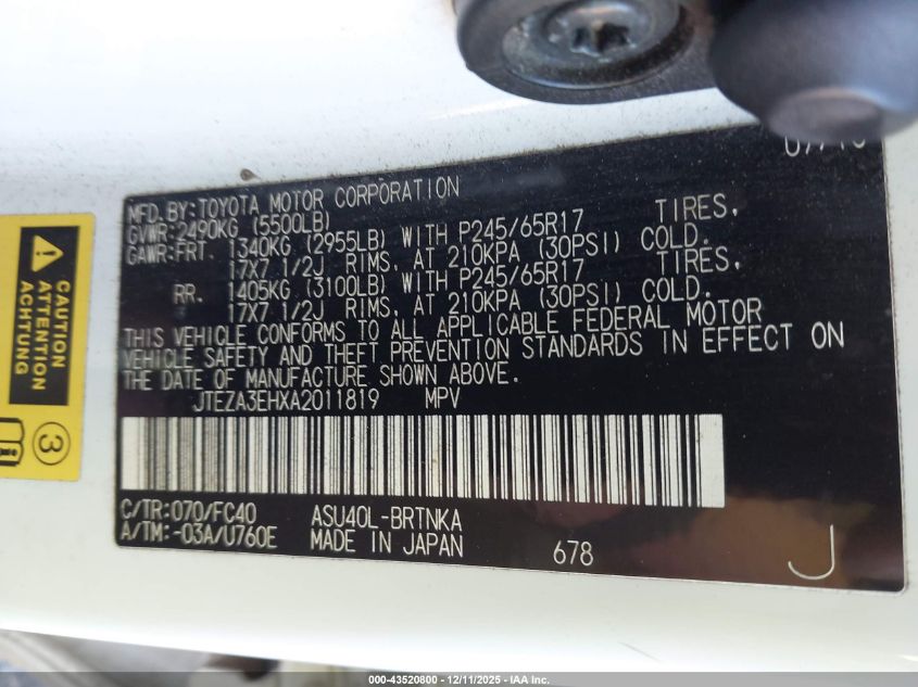 2010 TOYOTA HIGHLANDER - JTEZA3EHXA2011819, цвет - Белый, 2.7, Бензин, Передний привод из США