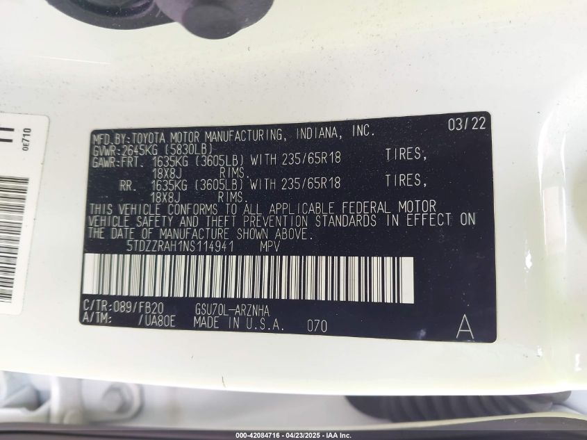 2022 TOYOTA HIGHLANDER - 5TDZZRAH1NS114941, цвет - Белый, 3.5, Бензин, Передний привод из США