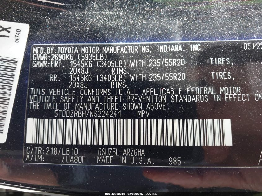 2022 TOYOTA HIGHLANDER - 5TDDZRBH7NS224241, цвет - , 3.5, Бензин, Полный привод из США