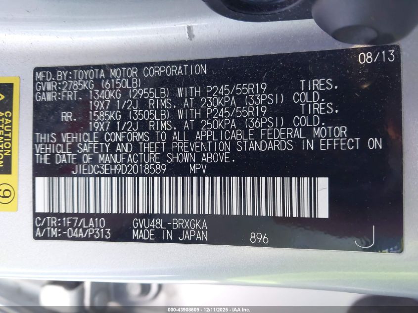 Цвет СеребряныйЦилиндры 6Привод Полный приводVIN JTEDC3EH9D2018589Состояние СтационарноПовреждения Обычный износ