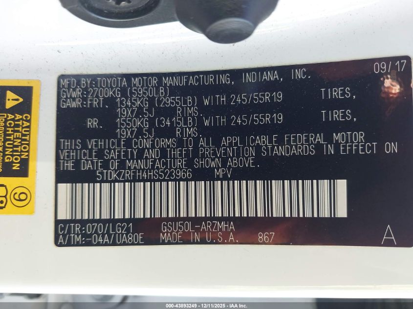 2017 TOYOTA HIGHLANDER - 5TDKZRFH4HS523966, цвет - Белый, 3.5, Бензин, Передний привод из США