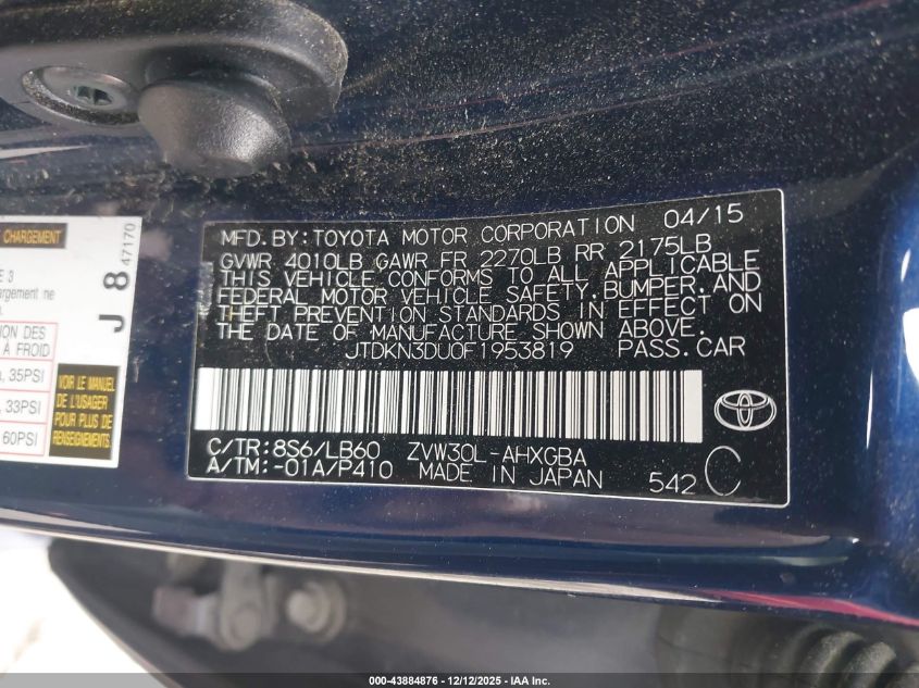 Цвет СинийЦилиндры 4Привод Передний приводVIN JTDKN3DU0F1953819Состояние СтационарноПовреждения Передняя или задняя