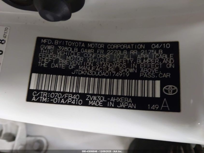 Цвет БелыйЦилиндры 4Привод Передний приводVIN JTDKN3DU0A0174919Состояние СтационарноПовреждения Задняя