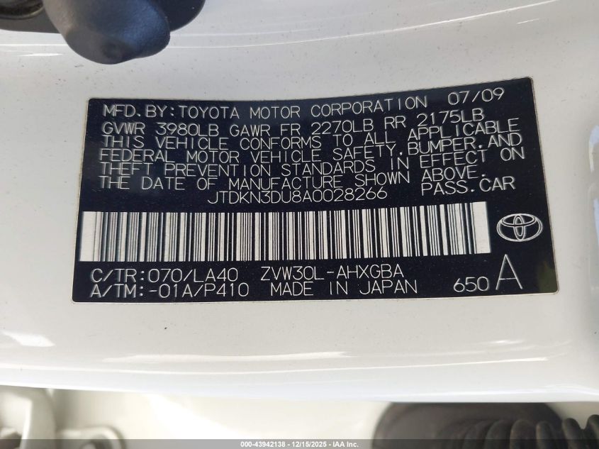 Цвет БелыйЦилиндры 4Привод Передний приводVIN JTDKN3DU8A0028266Состояние НеизвестноПовреждения Неизвестно
