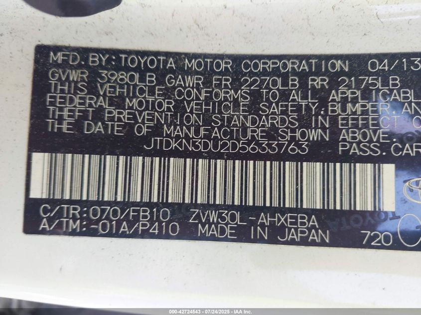 2013 TOYOTA PRIUS - JTDKN3DU2D5633763, цвет - Белый, 1.8, Гибрид, Передний привод из США