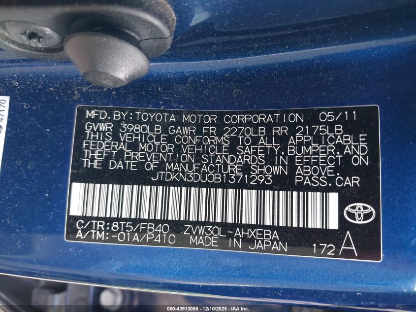 Цвет ЧерныйЦилиндры 4Привод Передний приводVIN JTDKN3DU0B1371293Состояние СтационарноПовреждения Обычный износДата аукциона 2025-12-16