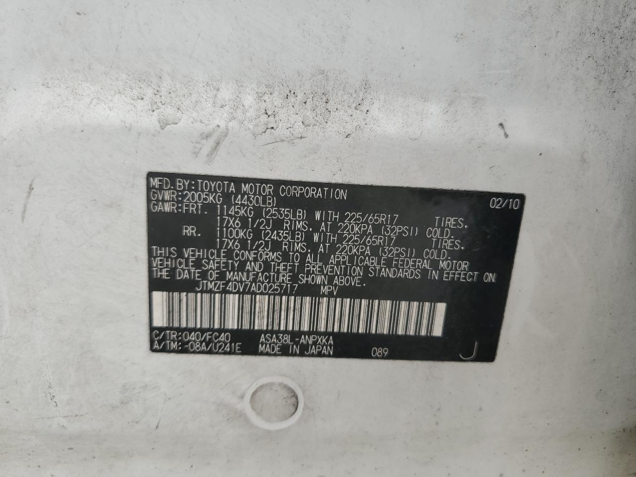 Цвет БелыйЦилиндры 4VIN JTMZF4DV7AD025717Состояние НеизвестноПовреждения НезначительныеДата аукциона 2025-10-13