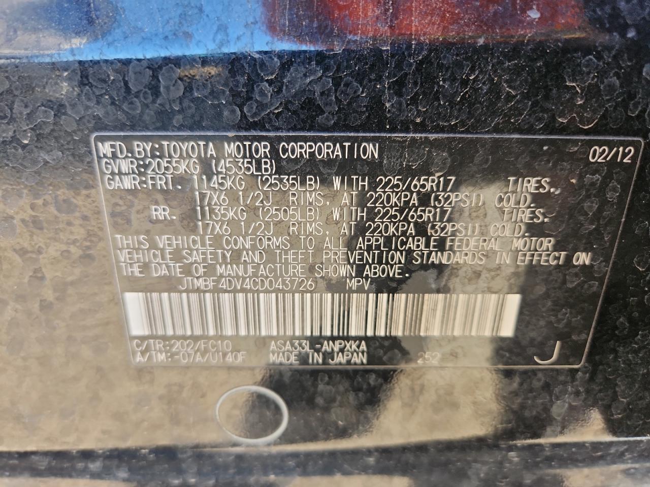 Цвет ЧерныйЦилиндры 4Привод Полный приводVIN JTMBF4DV4CD043726Состояние Заводится и едет (проверено)Повреждения По бокам