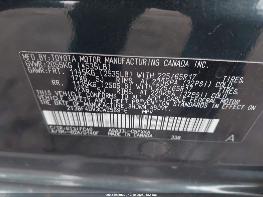 Цвет СинийЦилиндры 4Привод Полный приводVIN 2T3BF4DV3CW256816Состояние СтационарноПовреждения Обычный износДата аукциона 2025-12-17