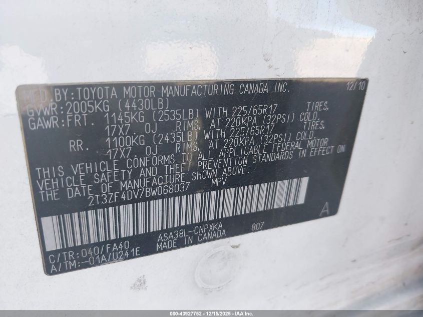 2011 TOYOTA RAV4 - 2T3ZF4DV7BW068037, цвет - Белый, 2.5, Бензин, Передний привод из США