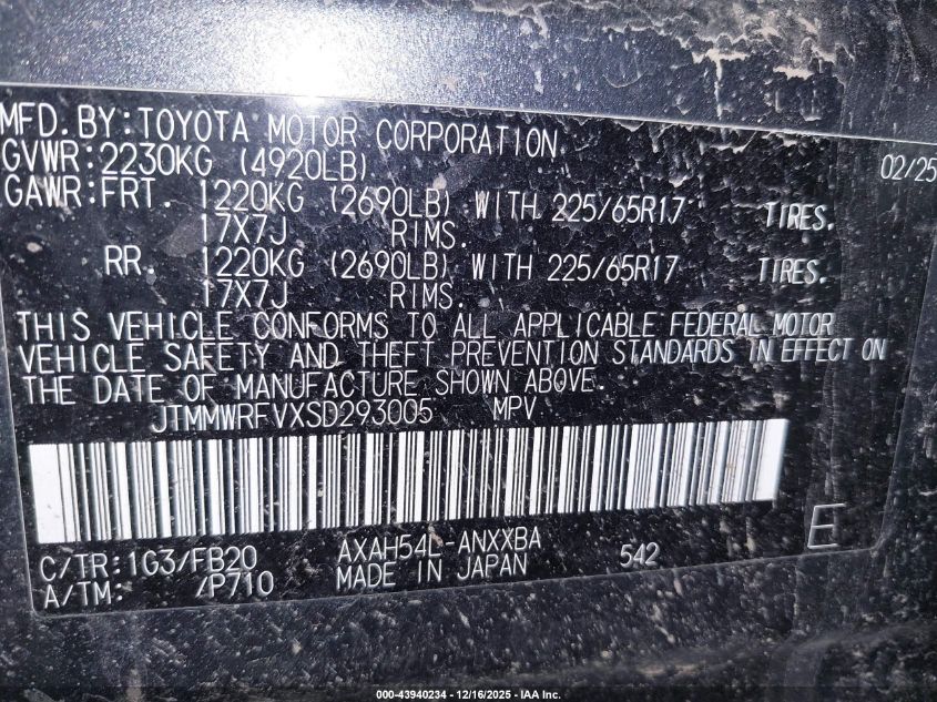 Цвет Цилиндры 4Привод Полный приводVIN JTMMWRFVXSD293005Состояние НеизвестноПовреждения Неизвестно