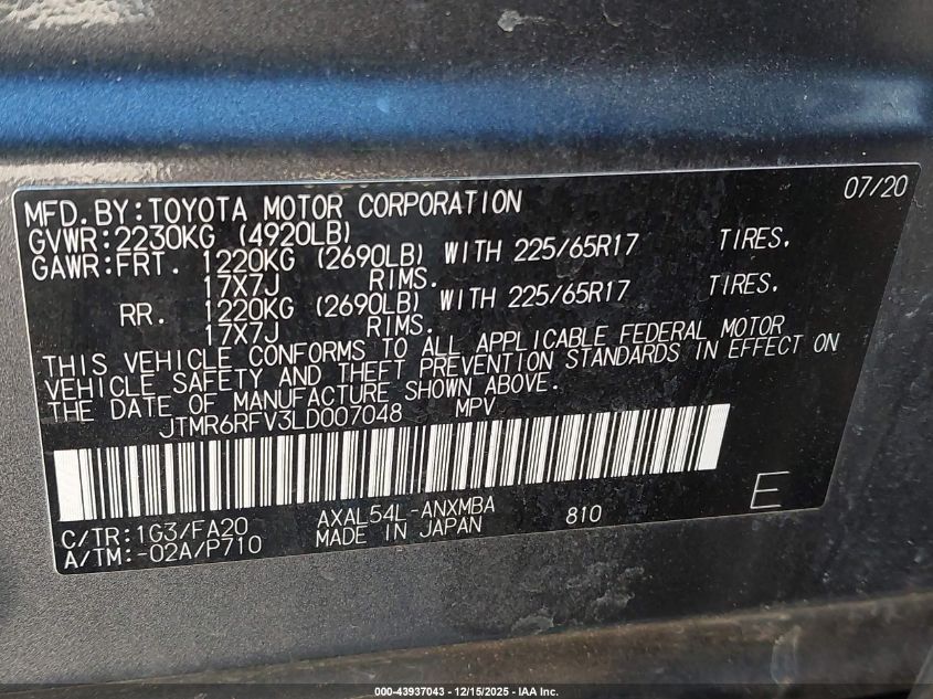 2020 TOYOTA RAV4 HYBRID - JTMR6RFV3LD007048, цвет - Серый, 2.5, Гибрид, Полный привод из США