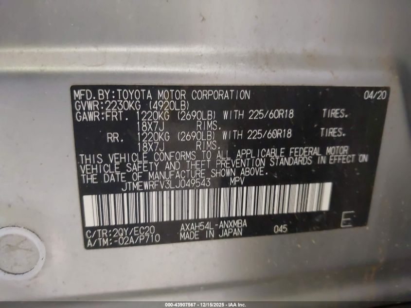Цвет СерыйЦилиндры 4Привод Полный приводVIN JTMEWRFV3LJ049543Состояние СтационарноПовреждения Передняя или задняя