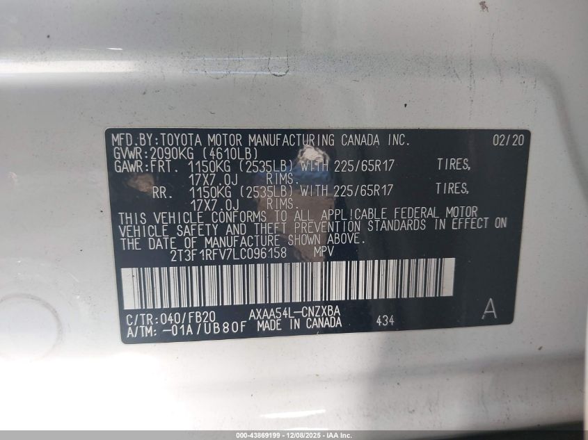 2020 TOYOTA RAV4 - 2T3F1RFV7LC096158, цвет - Белый, 2.5, Бензин, Полный привод из США