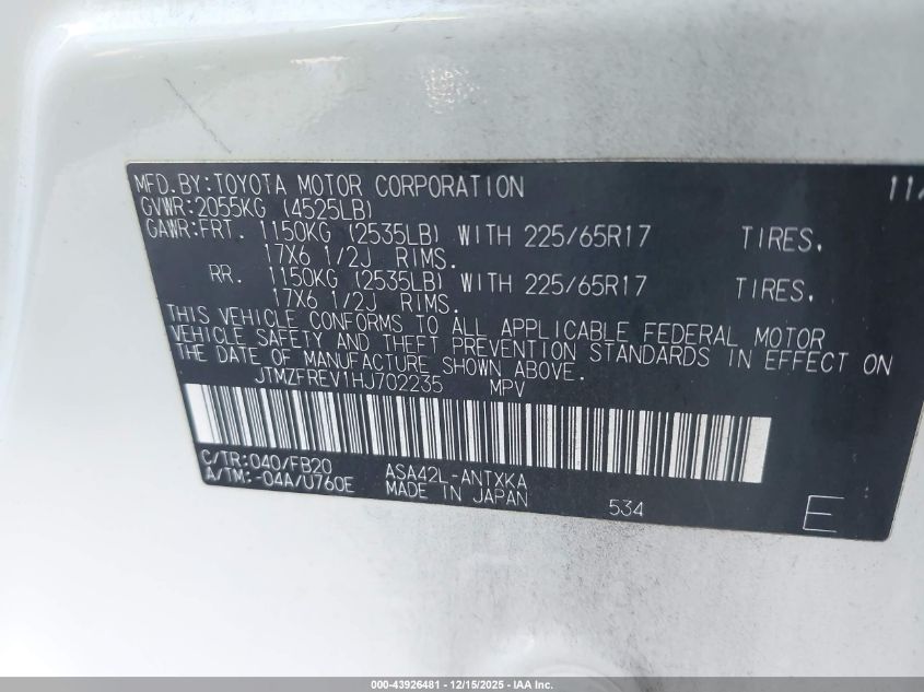 2017 TOYOTA RAV4 - JTMZFREV1HJ702235, цвет - Белый, 2.5, Бензин, Передний привод из США