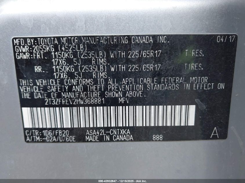 2017 TOYOTA RAV4 - 2T3ZFREV2HW368881, цвет - Серый, 2.5, Бензин, Передний привод из США