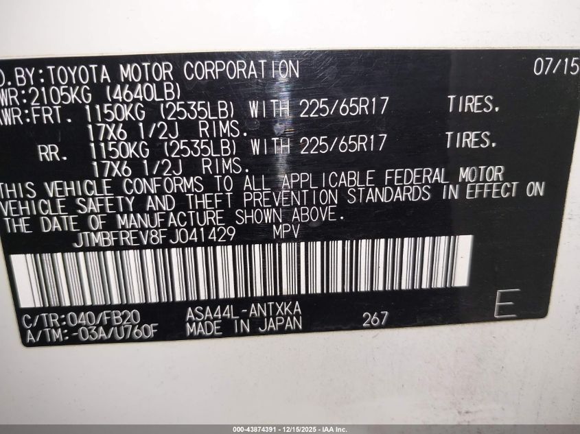 Цвет Цилиндры 4Привод Полный приводVIN JTMBFREV8FJ041429Состояние НеизвестноПовреждения Неизвестно