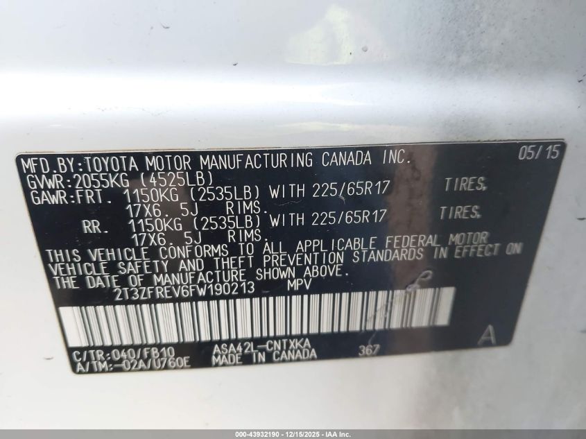 2015 TOYOTA RAV4 - 2T3ZFREV6FW190213, цвет - Белый, 2.5, Бензин, Передний привод из США