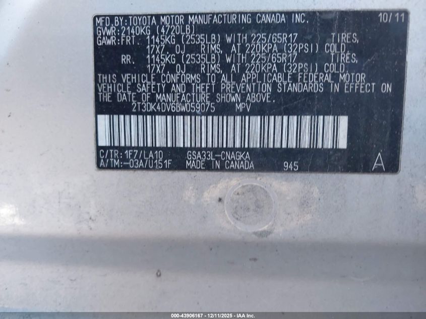 Цвет СерыйЦилиндры 6Привод Полный приводVIN 2T3DK4DV6BW059075Состояние СтационарноПовреждения Обычный износ