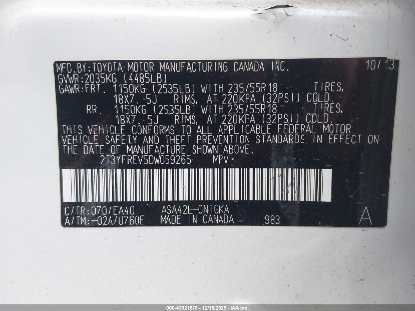 2013 TOYOTA RAV4 - 2T3YFREV5DW059265, цвет - Белый, 2.5, Бензин, Передний привод из США