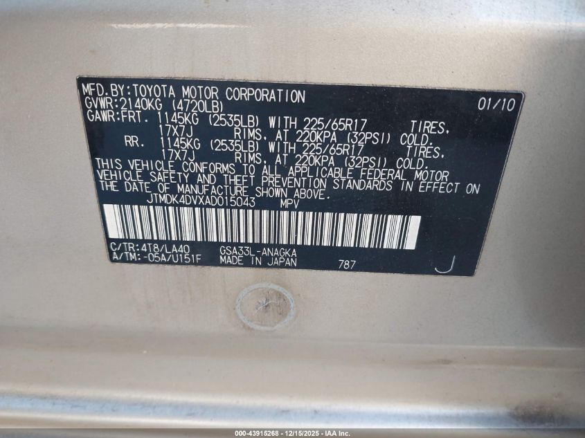 Цвет КоричневийЦилиндры 6Привод Полный приводVIN JTMDK4DVXAD015043Состояние СтационарноПовреждения Задняя