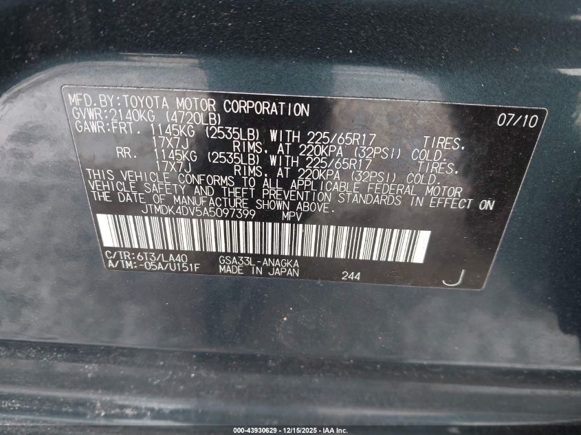 2010 TOYOTA RAV4 - JTMDK4DV5A5097399, цвет - Серый, 3.5, Бензин, Полный привод из США