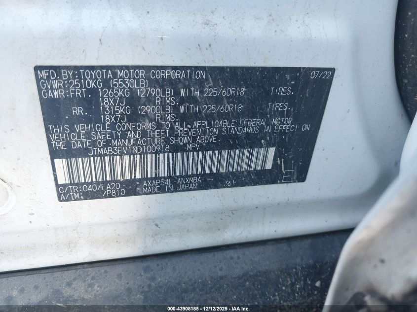Цвет БелыйЦилиндры 4Привод Полный приводVIN JTMAB3FV1ND100918Состояние СтационарноПовреждения Неизвестно