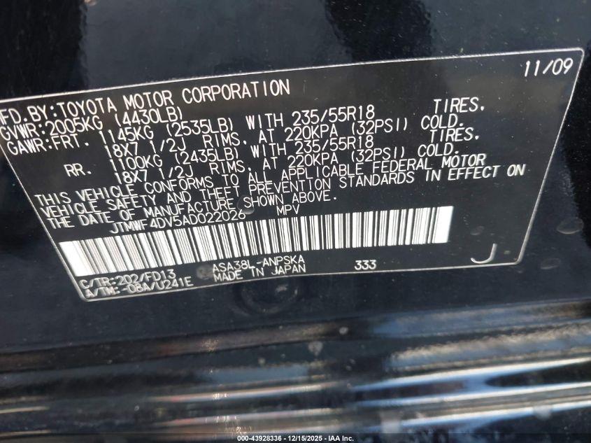 Цвет ЧерныйЦилиндры 4Привод Передний приводVIN JTMWF4DV5AD022026Состояние СтационарноПовреждения Левая сторона