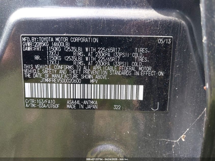 2013 TOYOTA RAV4 - JTMRFREV5DD020600, цвет - Серый, 2.5, Бензин, Полный привод из США
