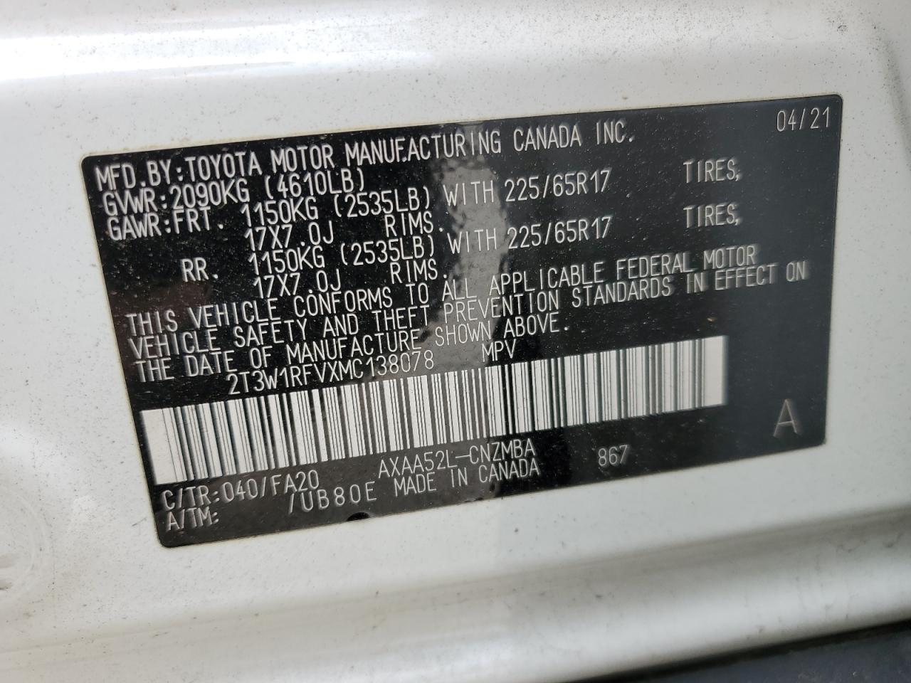 Цвет БелыйЦилиндры 4VIN 2T3W1RFVXMC138078Состояние ЗаводитсяПовреждения Задняя