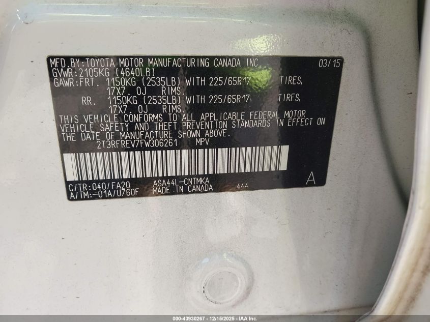 2015 TOYOTA RAV4 - 2T3RFREV7FW306261, цвет - Белый, 2.5, Бензин, Полный привод из США