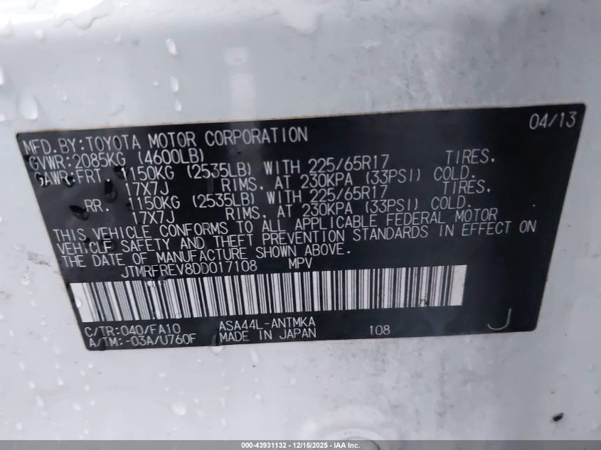 Цвет БелыйЦилиндры 4Привод Полный приводVIN JTMRFREV8DD017108Состояние Заводится и едет (проверено)Повреждения Задняя