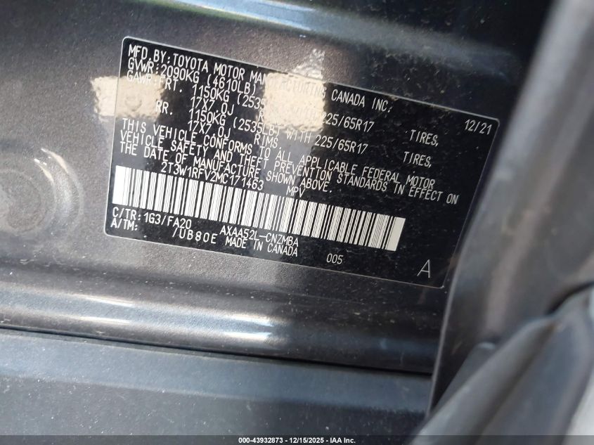 Цвет СерыйЦилиндры 4Привод Передний приводVIN 2T3W1RFV2MC171463Состояние СтационарноПовреждения Передняя или задняя