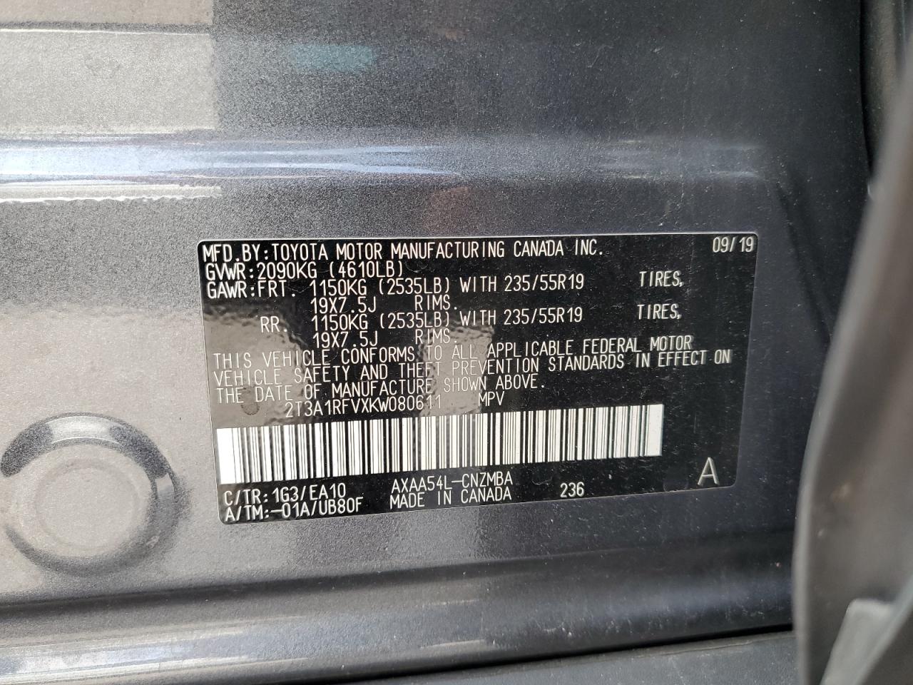 2019 TOYOTA RAV4 - 2T3A1RFVXKW080611, цвет - Серый, 2.5, Бензин, Полный привод из США