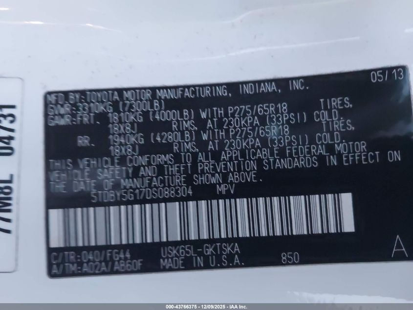 2013 TOYOTA SEQUOIA - 5TDBY5G17DS088304, цвет - Белый, 5.7, Бензин, Полный привод из США