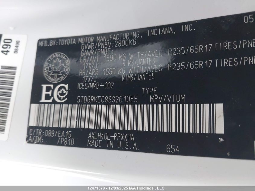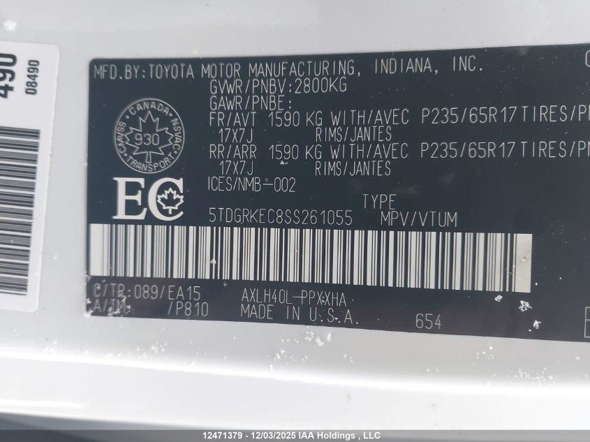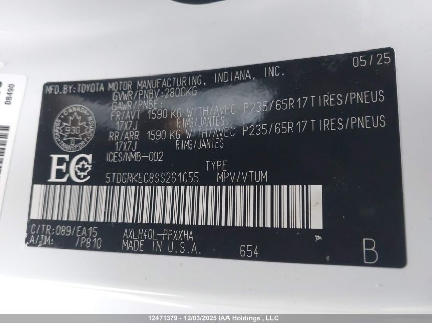 Цвет БелыйЦилиндры 4Привод Передний приводVIN 5TDGRKEC8SS261055Состояние СтационарноПовреждения Передняя леваяДата аукциона 2025-12-15