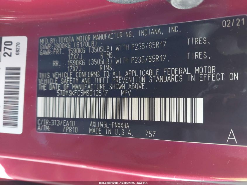 2021 TOYOTA SIENNA - 5TDYSKFC5MS013517, цвет - Красный, 2.5, Гибрид, Полный привод из США