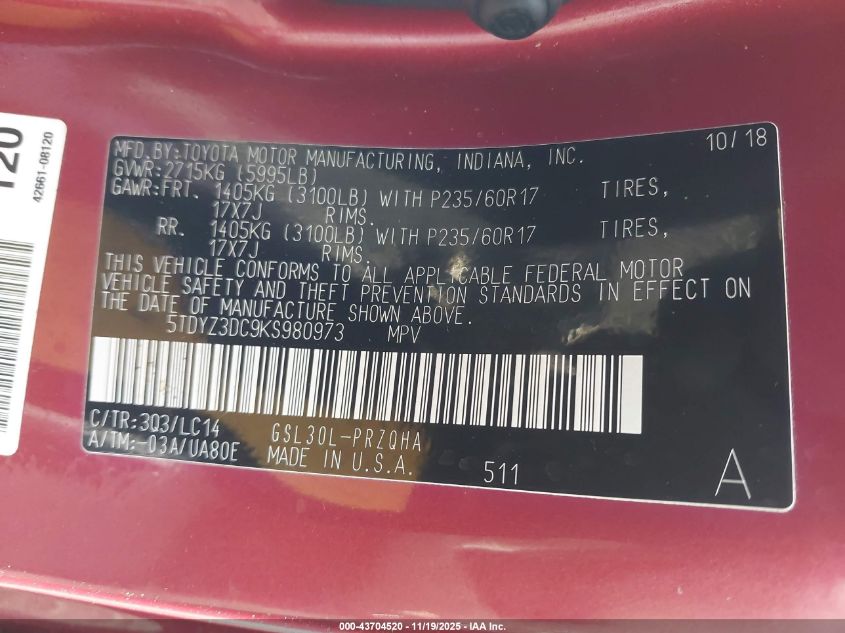 2019 TOYOTA SIENNA