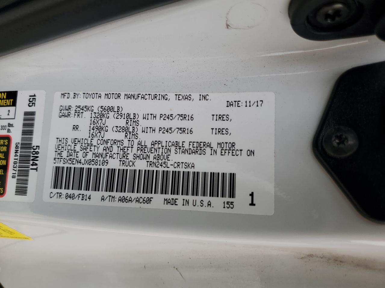 2018 TOYOTA TACOMA - 5TFSX5EN4JX058109, цвет - Белый, 2.7, Бензин, 4x4 с задним приводом из США